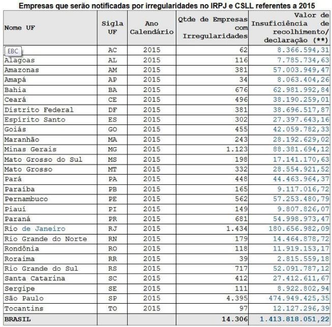 A Receita Federal orienta as empresas com irregularidades no IRPJ e na CSLL dos anos-calendário seguintes a se autorregularizarem. Em junho de 2019, serão iniciadas as ações referentes ao ano-calendário 2015, com envio de cartas para mais de 14 mil empresas que apresentam inconsistências nos recolhimentos e declarações de IRPJ e CSLL de aproximadamente R$ 1,5 bilhão.
